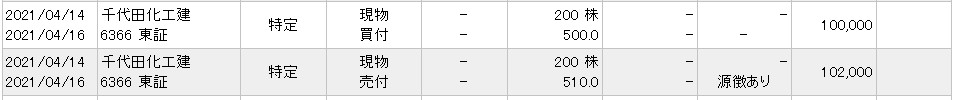 実は4/14の売買は意図ぜずにデイトレに💦というのも指値いれて忘れてた千代田化工建が刺さっていて、でも買ってから考えたらやっぱりいらないなーと思ってプラス10円のところで手放しました。200株買ってたので、プラス2,000円に!ヾ(o´∀`o)ノワァーィ♪